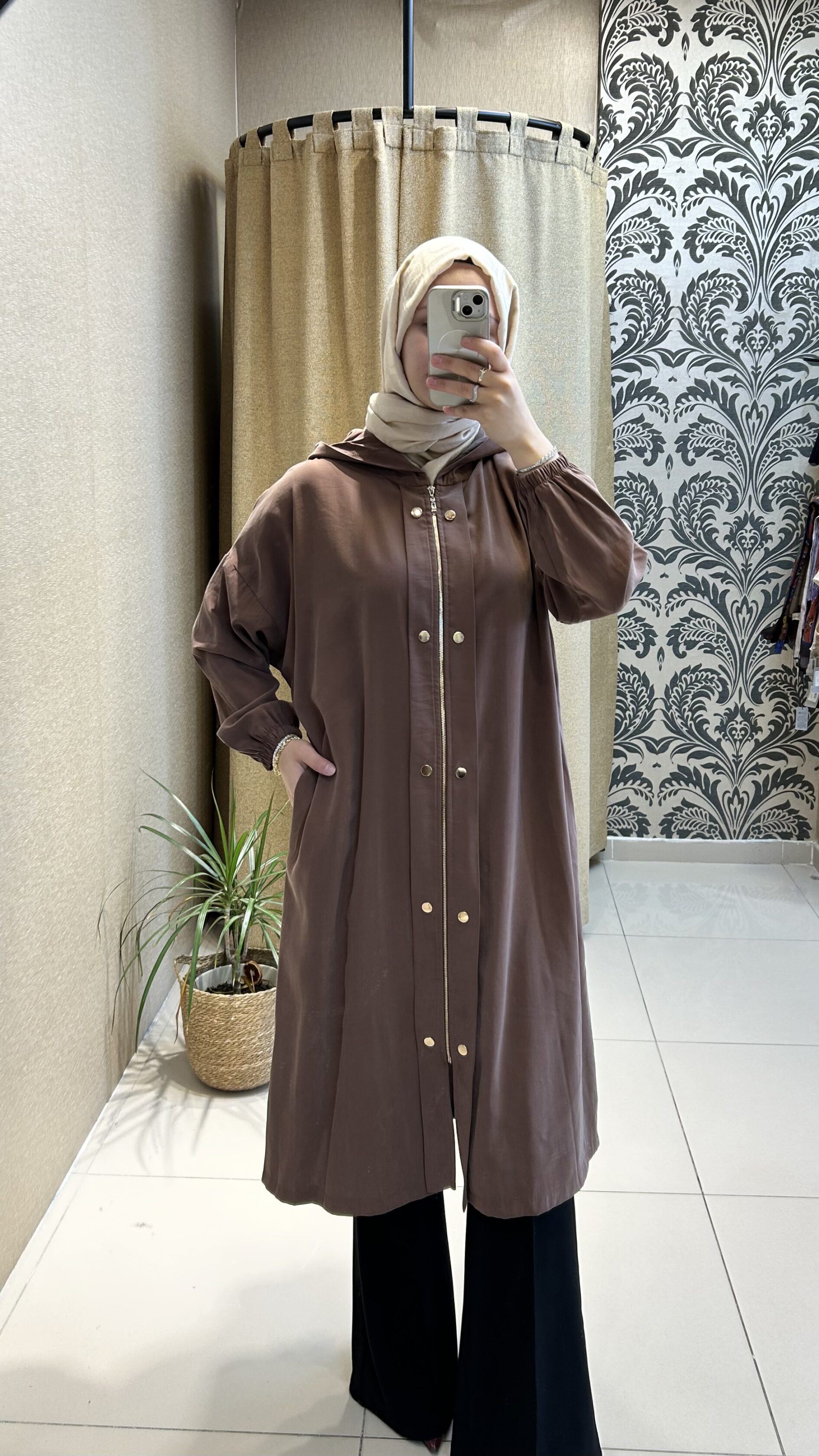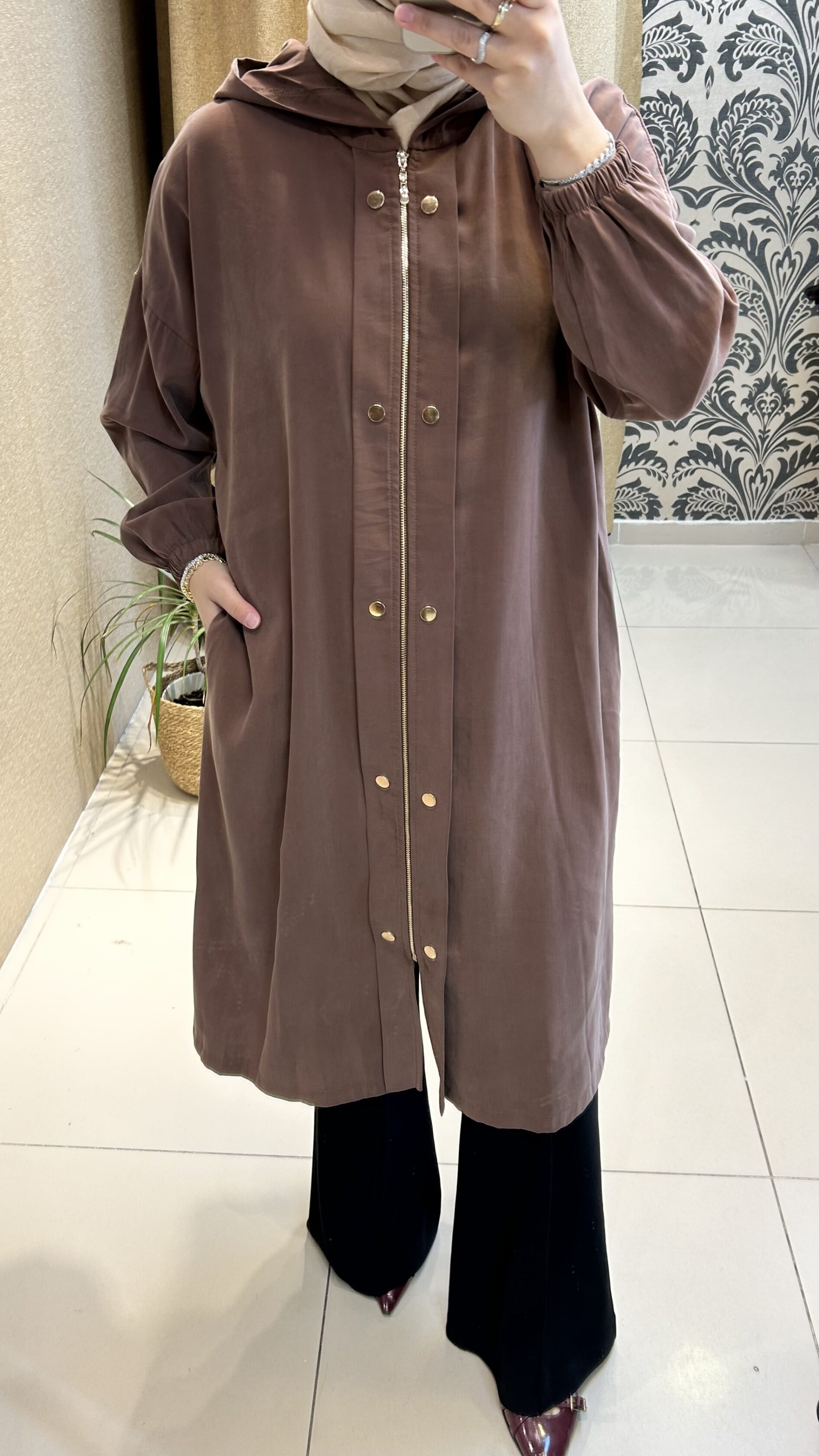 Bordo uzun ceket ve bol paça lastikli pantolon